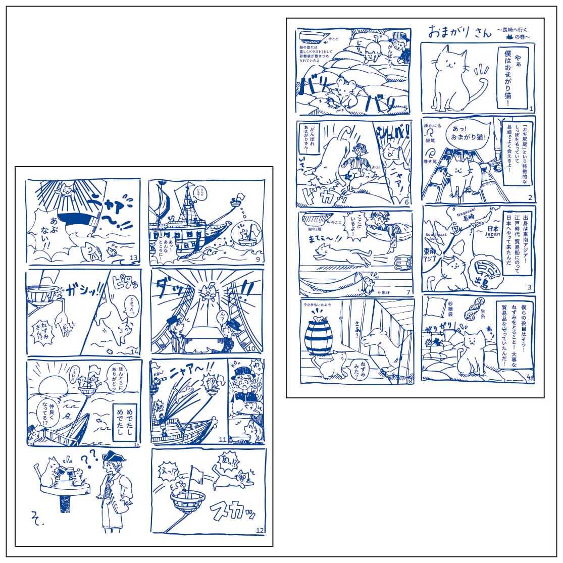 さて第一弾は、オランダ東インド会社の集積基地があったバタヴィア(現在のジャカルタ)から長崎へ向かうオランダ船の中で繰り広げられる、おまがり猫とネズミによるドタバタ漫画のポストカードと、そのハイライト・シーンが描かれた手ぬぐいがセットになった「おまがりさん~長崎へ行く~」です。